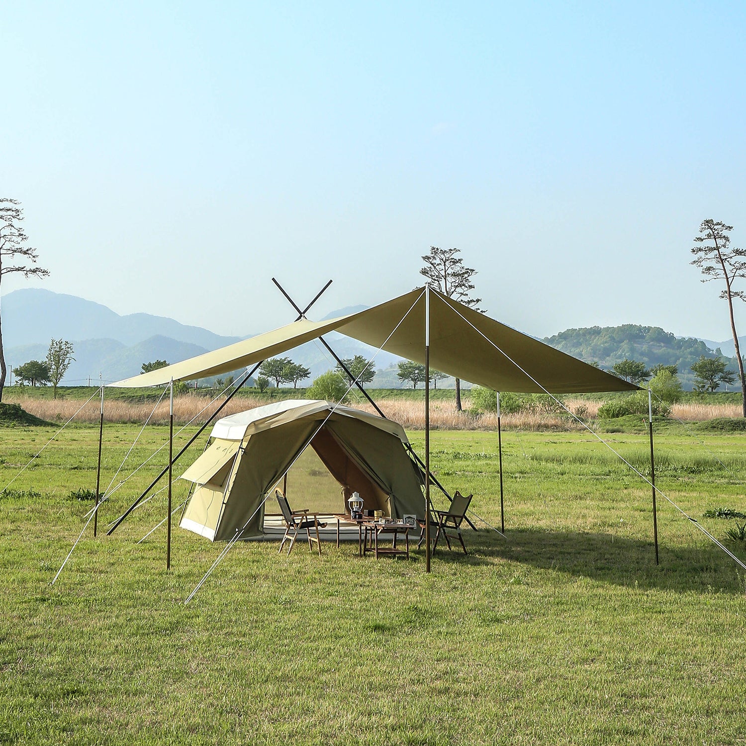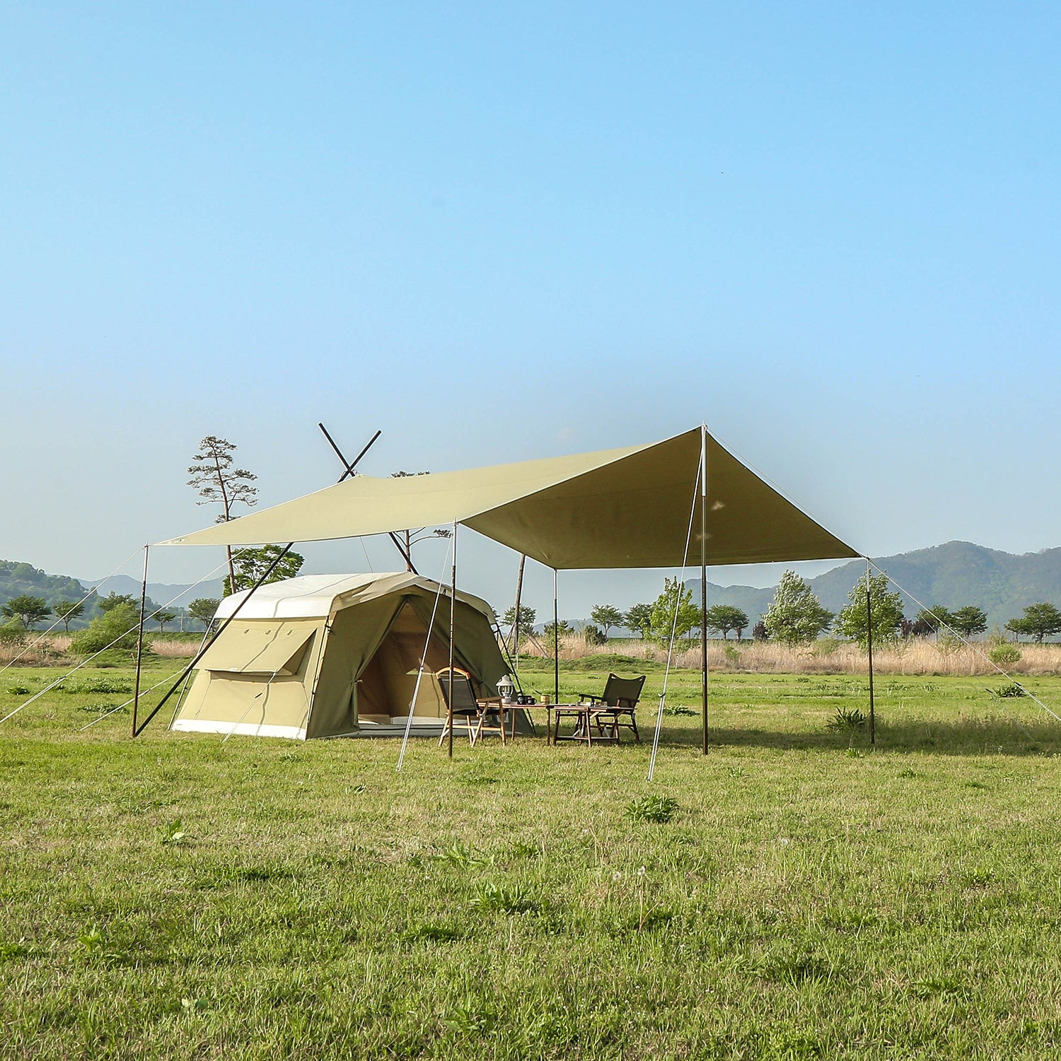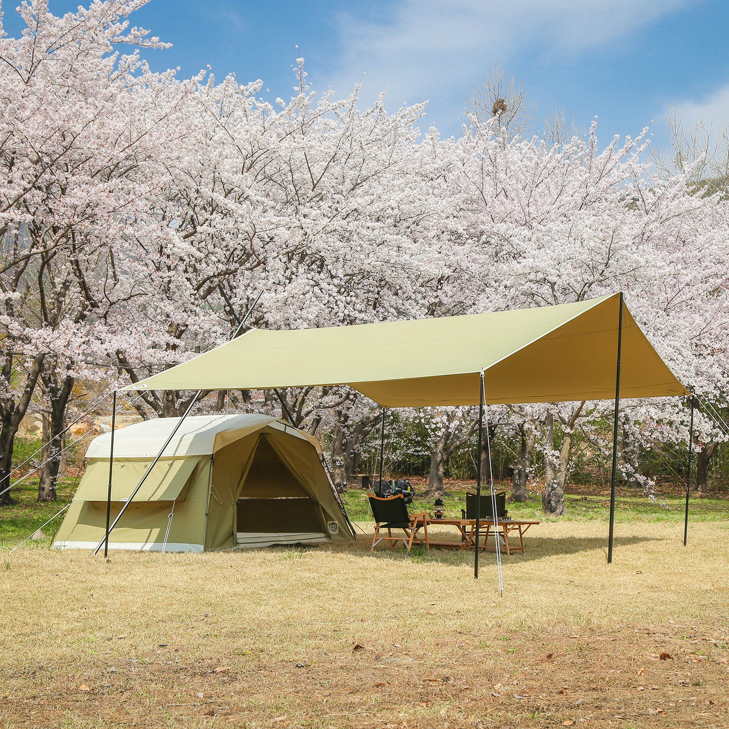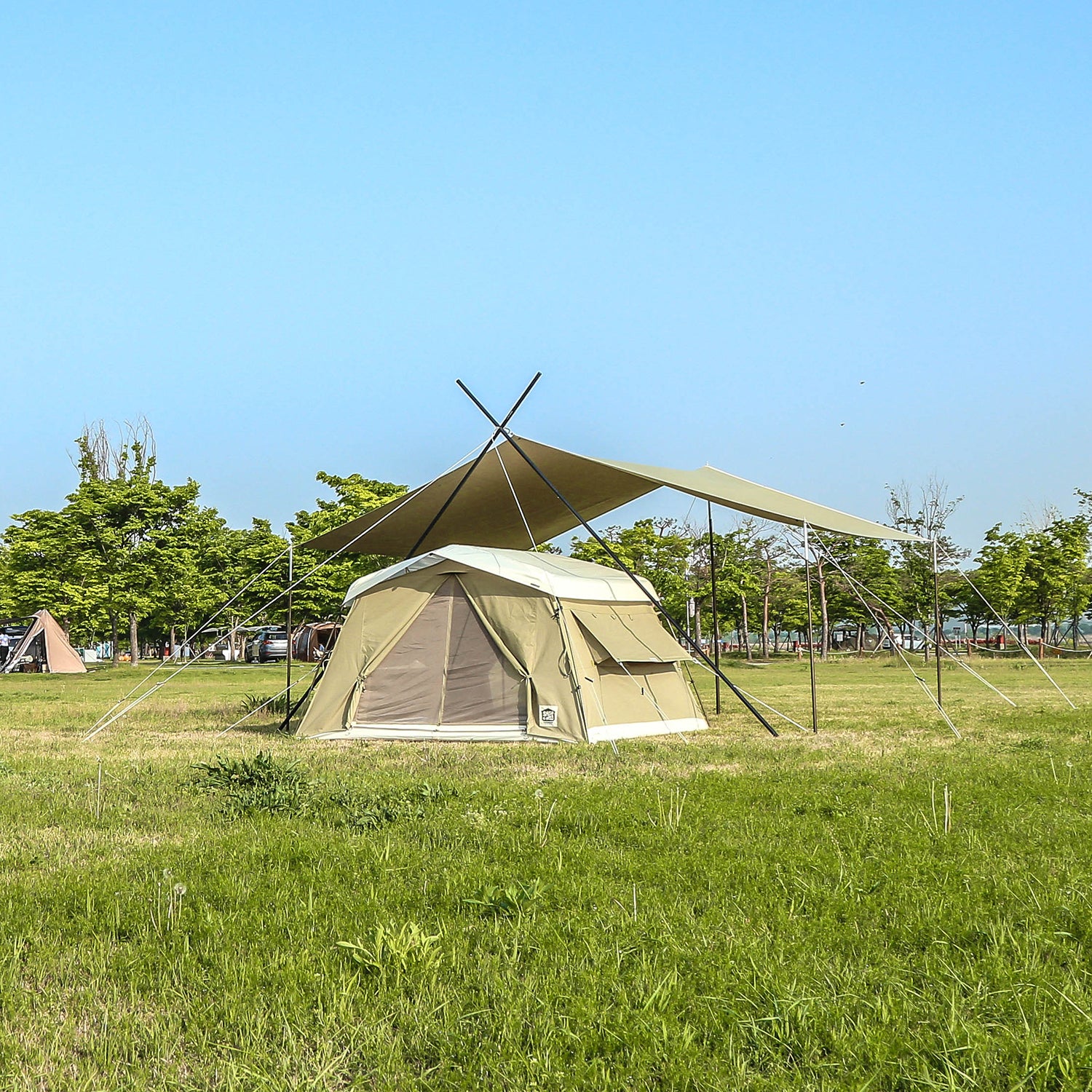 統一感の有るデザインソリオキャビンハウスと同素材で作られたソリオタープは、5.2m×4.8mのゆったりとしたスペースを誇ります。 -
