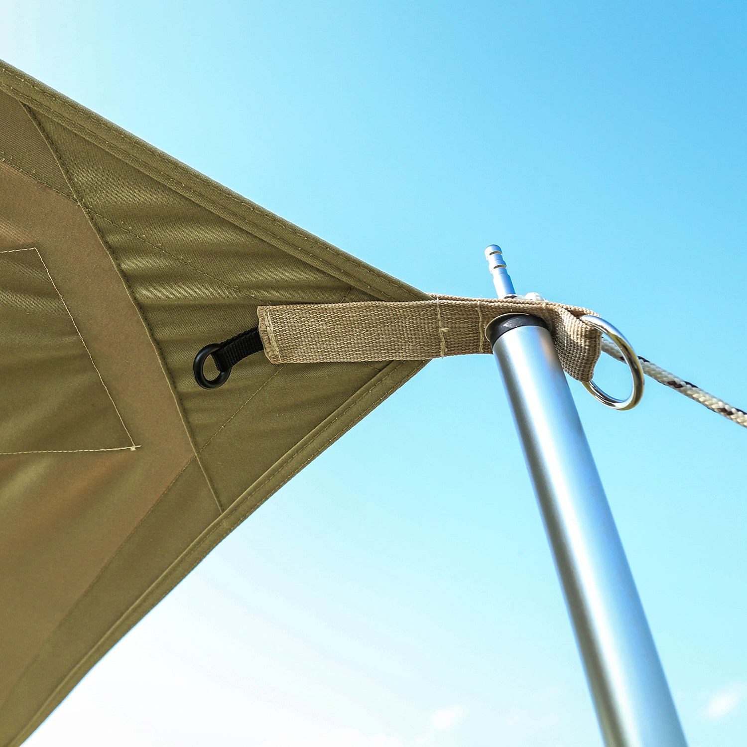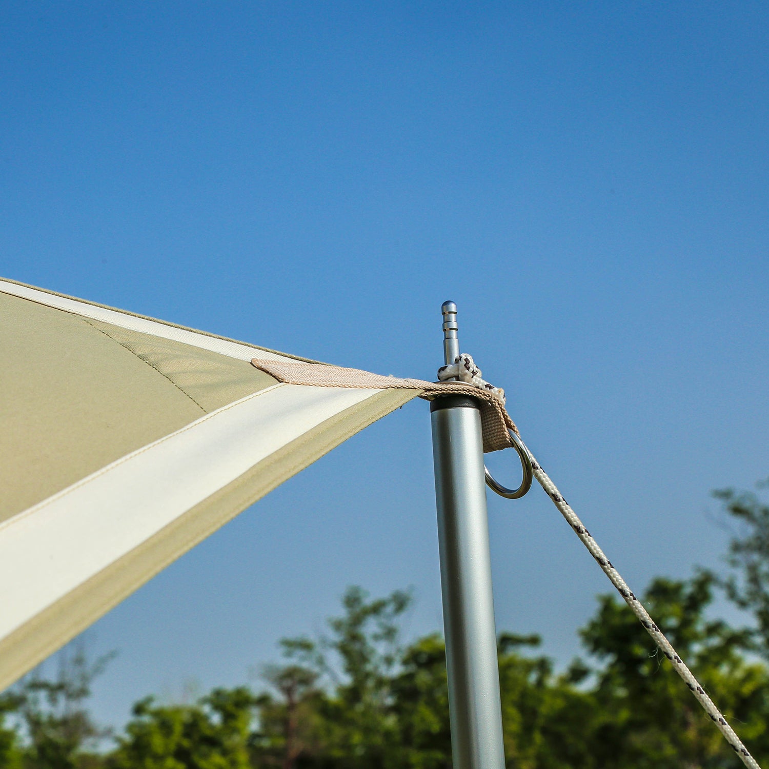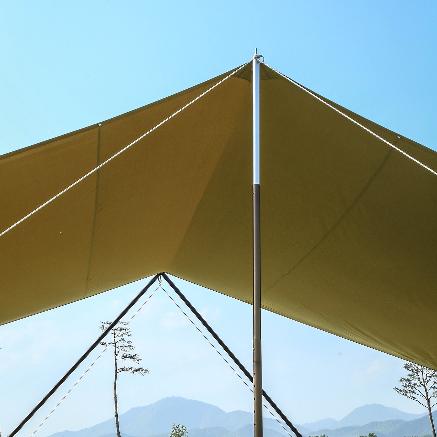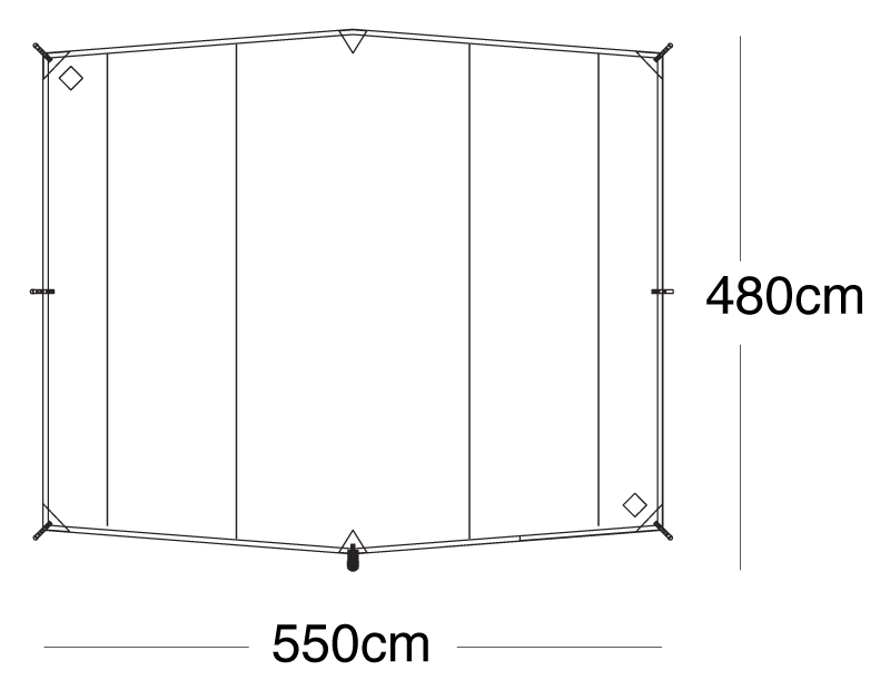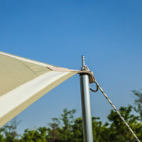 バイアステープタープがシワにならずに張りのある状態を保つために、バイアスで巻き付けて再度縫製する構造です。 この構造により、衝撃を受けてもタープの強度を保ち、美しいシルエットを生み出します。